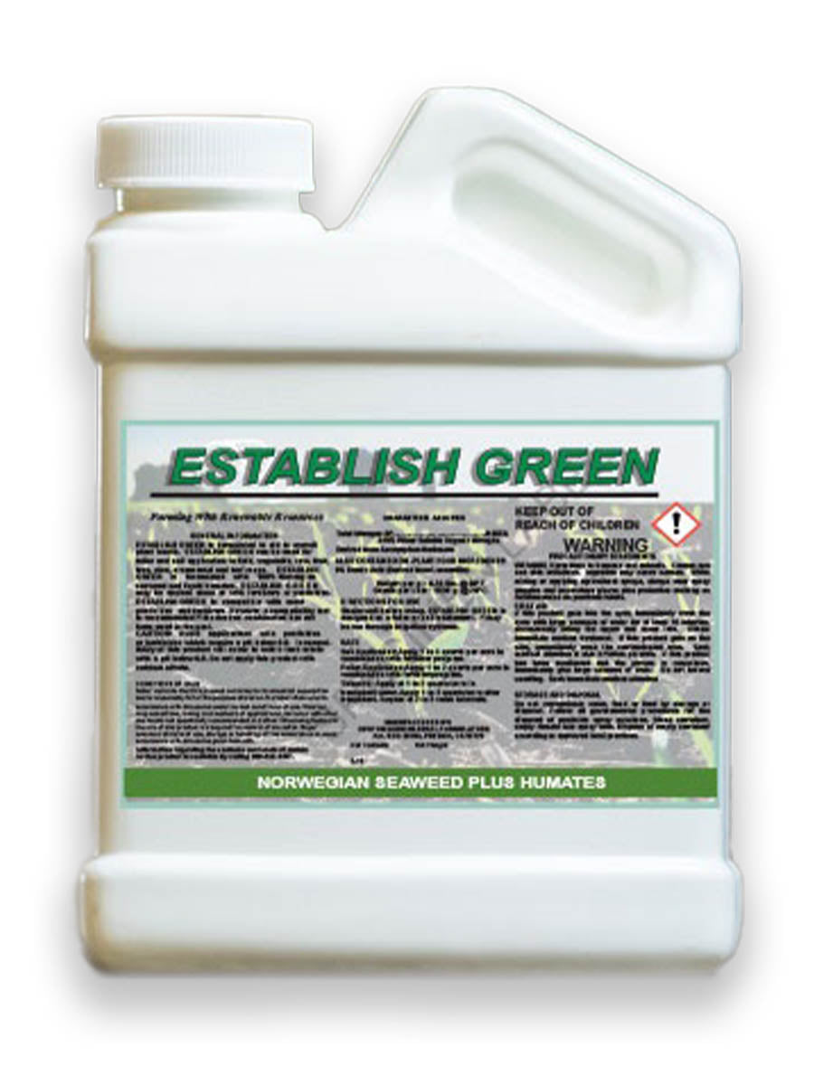 ESTABLISH GREEN is formulated to aid in overall plant health. ESTABLISH GREEN can be used for foliar and soil application to field, vegetable, row, fruit, tree, vine, ornamental and turf crops. ESTABLISH GREEN is formulated with 100% Norwegian seaweed and liquid humates. ESTABLISH GREEN may be applied alone or with fertilizers or pesticides. ESTABLISH GREEN is compatible with most pesticides and fertilizers. However, a compatibility test is recommended if the desired combination has not been used in the past.